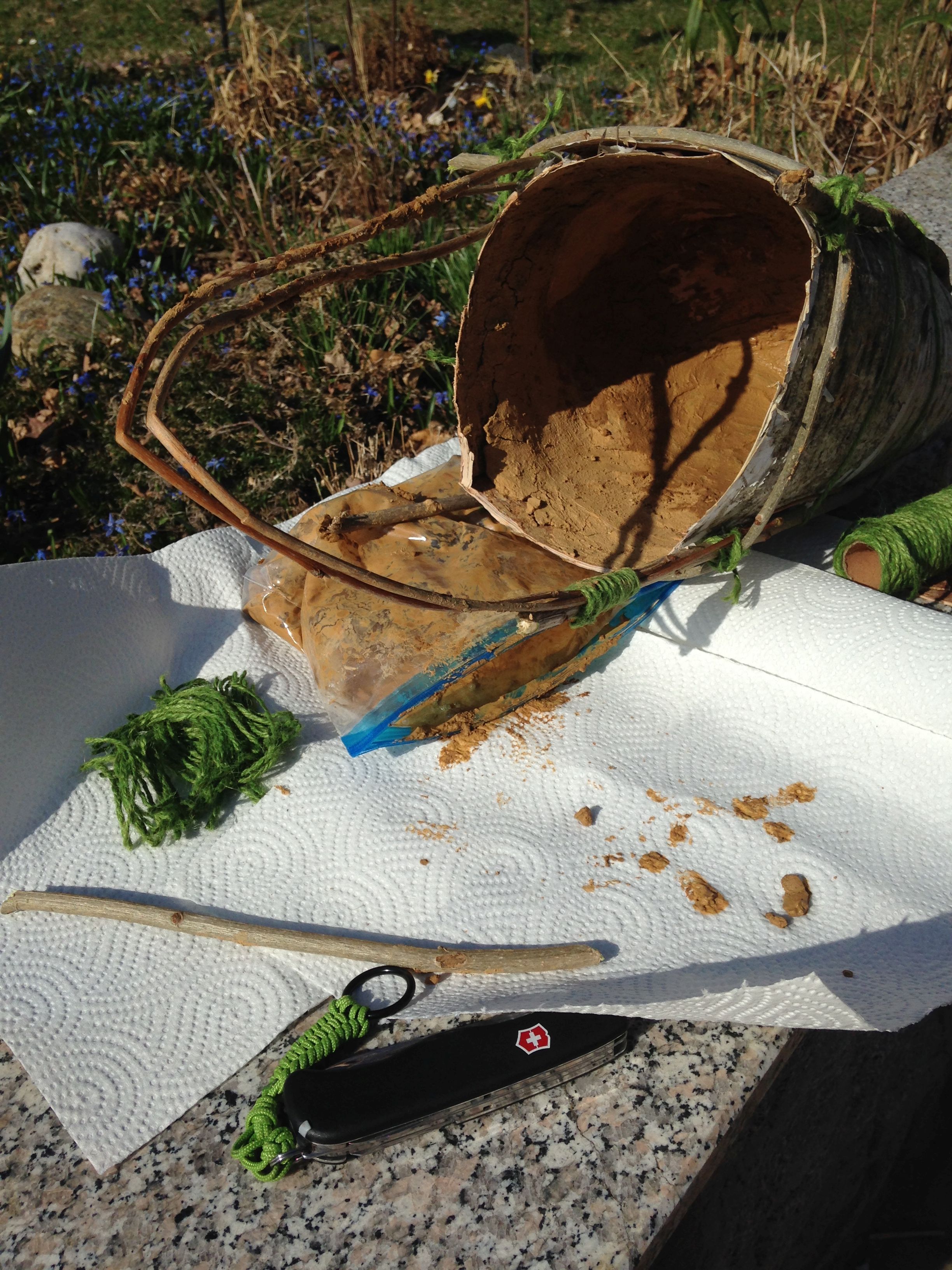 Außerdem hab ich das zeitlich nicht mehr hinbekommen, einen neuen Behälter aus Stöckchen und Rinde zu Zimmern für einen weiteren Versuch mit einem Gemisch aus Lehm, Sand und Schnur/Stroh (bzw. trockenem Gras aus dem Wald).