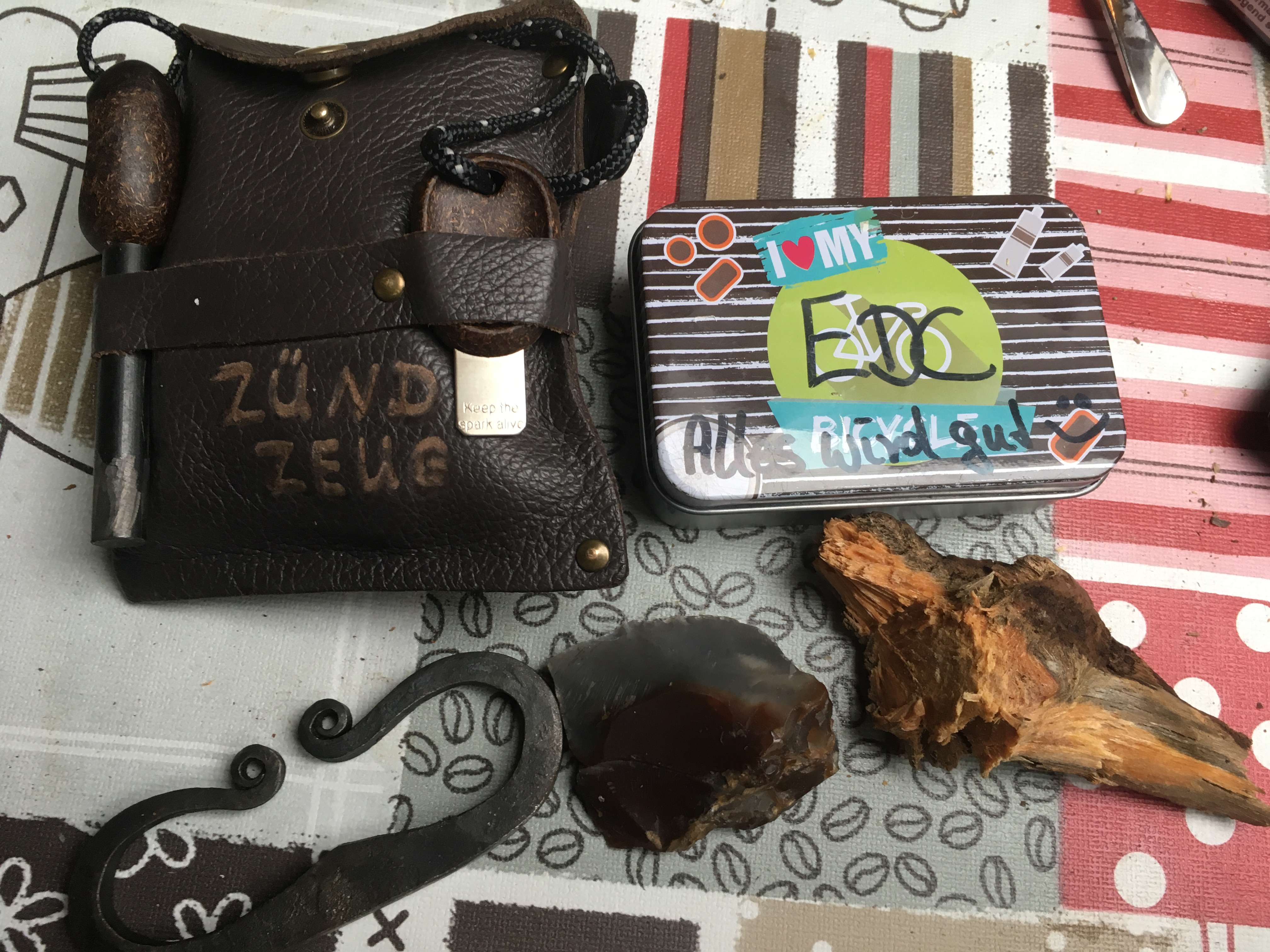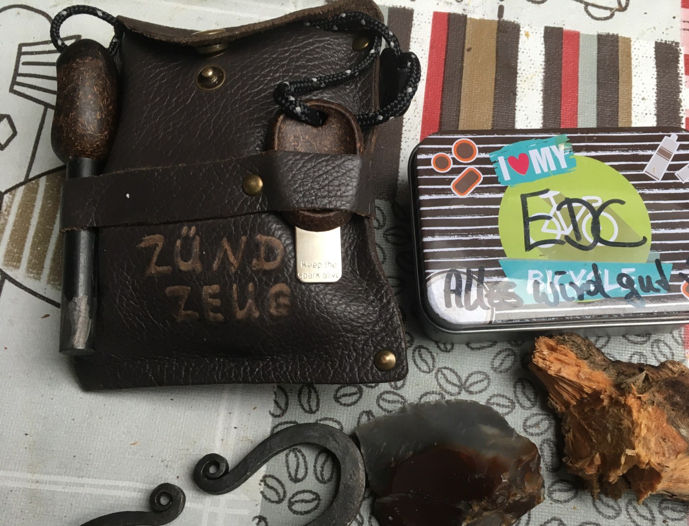 Einiges zum Rumspielen und Probieren: Birkenrinde, Kienholz, Trocknerflusen (geiler Zunder, fackelt super an, aber ebenso schnell ab..), verkohlte Baumwollstückchen, Wachs-Watte-Zunder – und außen dran der Light-my-fire-Mischmetallstab, der an zwei gut passenden Schlaufen befestigt ist.