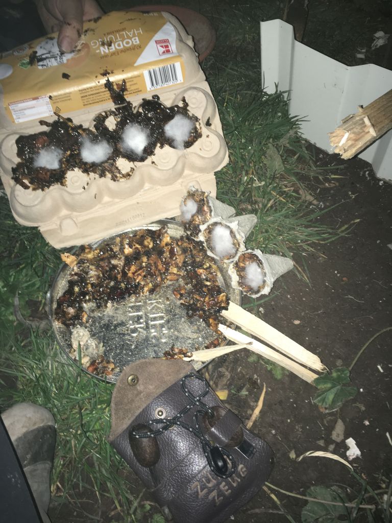 Eine Zunderbombe (einzelnes Eier-Teil) brennt für sich allein schon über 10 Minuten, wobei ich da beim zeit-Test noch großzügig darin herum gestochert habe … den müsst ich wiederholen.