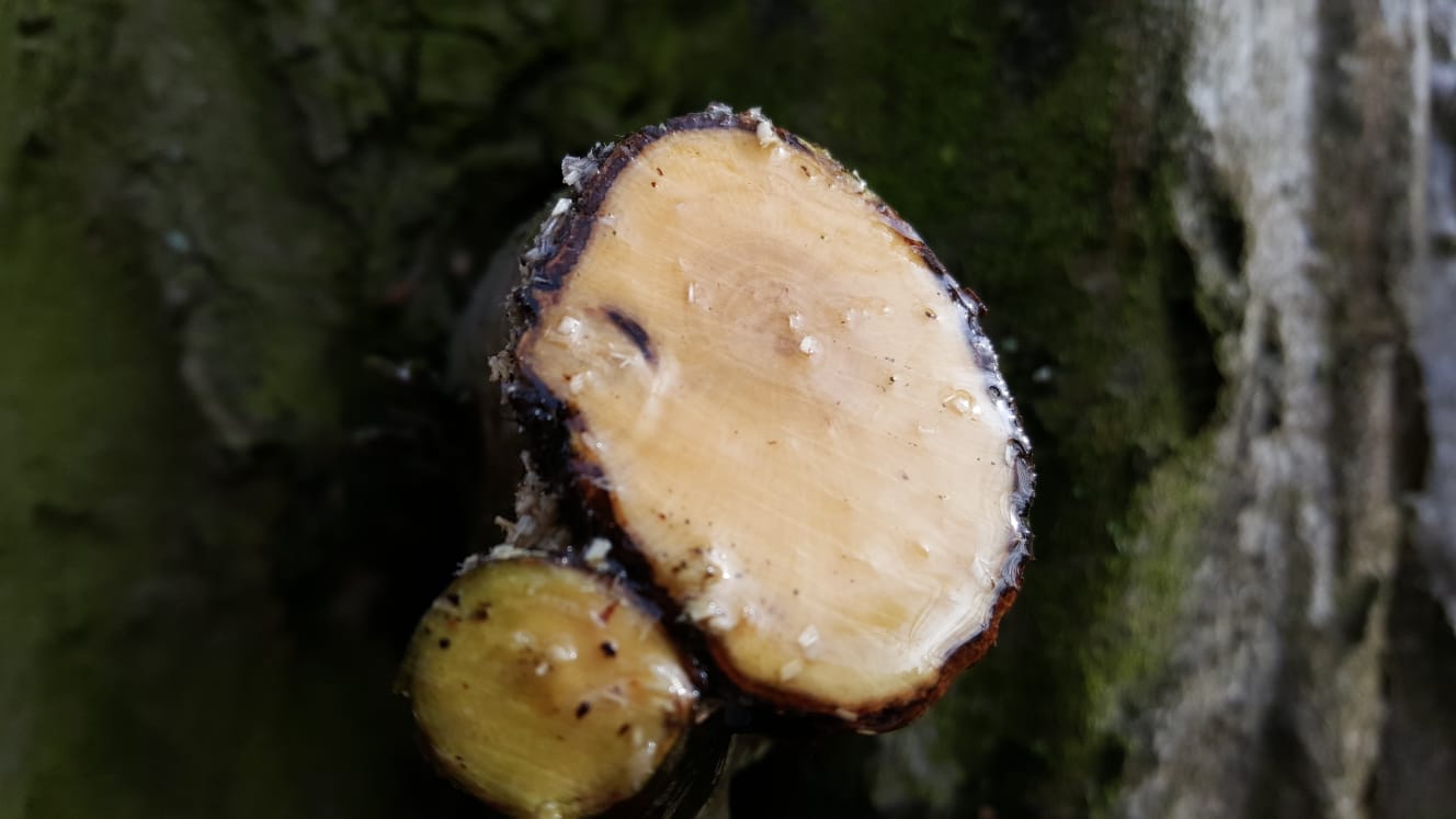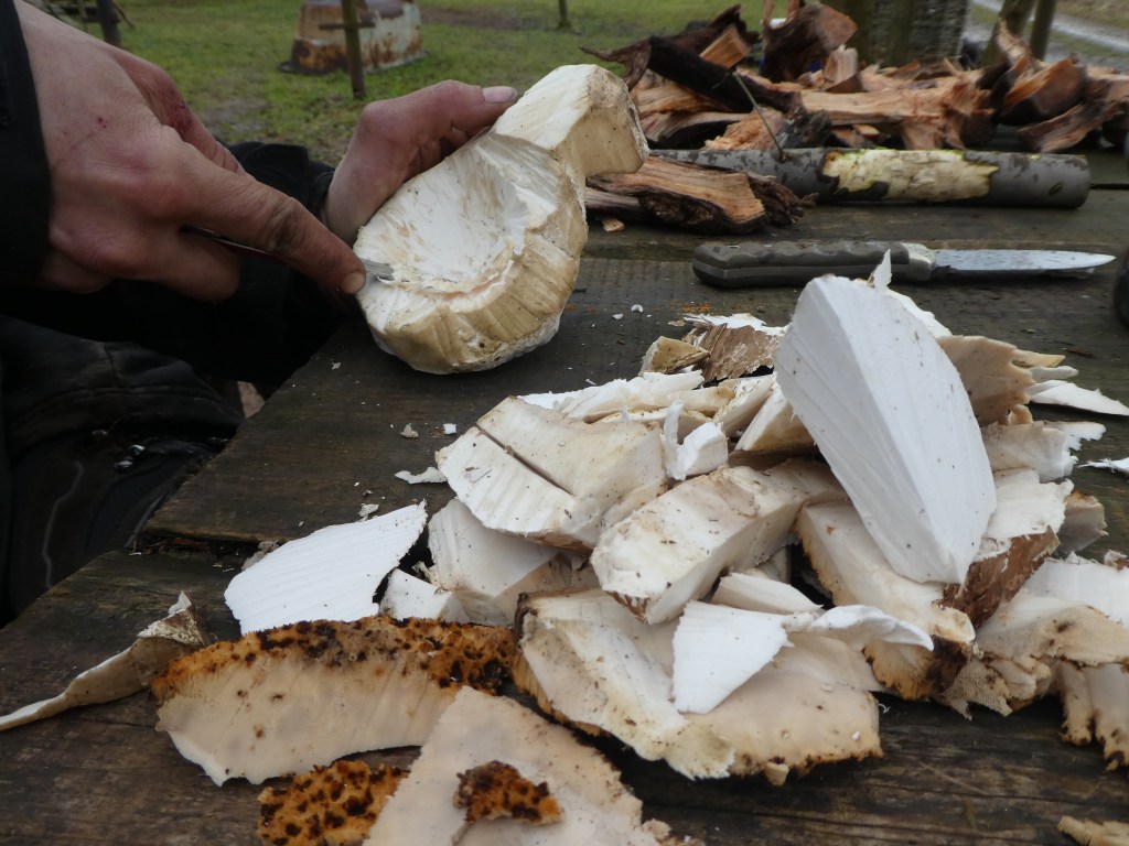Aus einem frisch geernteten Birkenporling wurde eine Kuksa geschnitzt – weil es geht.