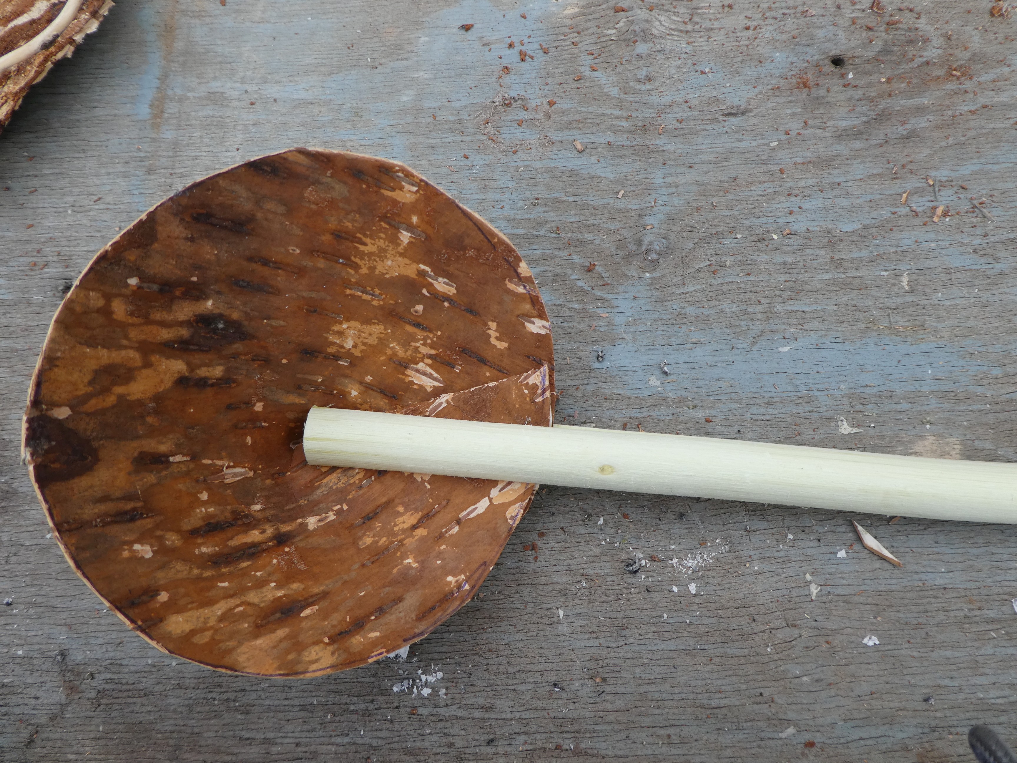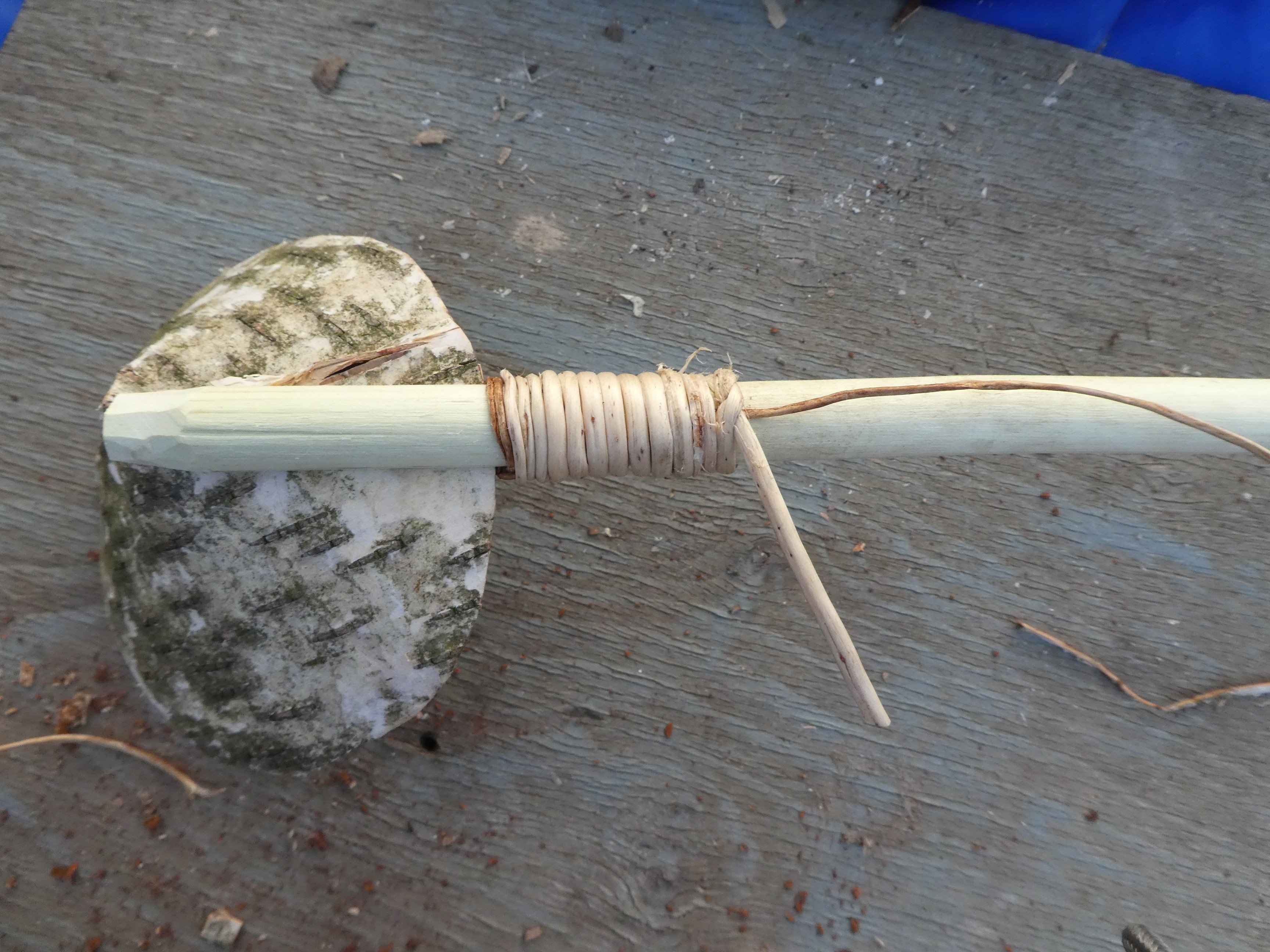 Der Grabstock ist ein nützliches Universalwerkzeug. Hier wurde er genutzt, um Birkenrinde vorsichtig vom Baum zu schälen und Fichtenwurzeln auszugraben.