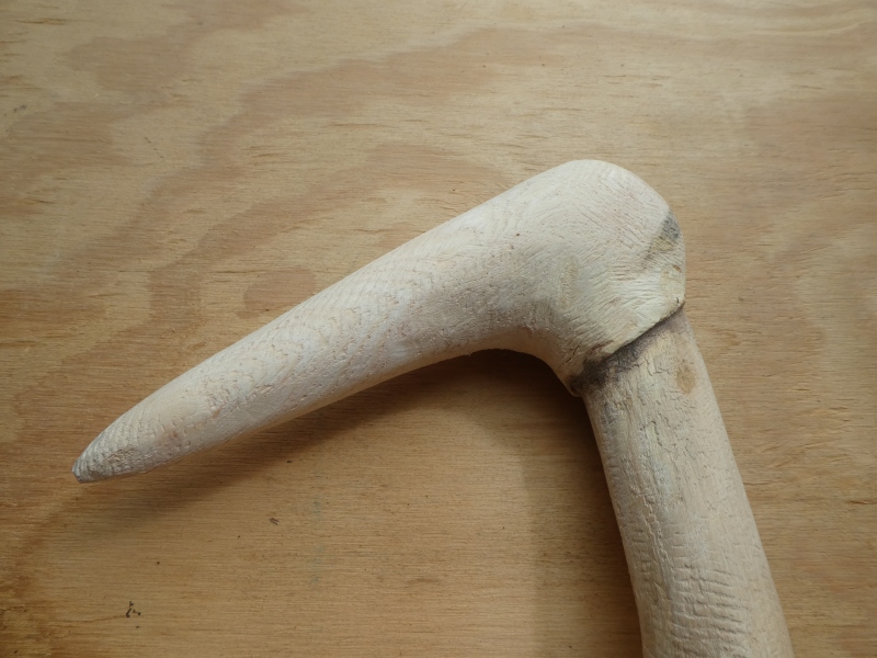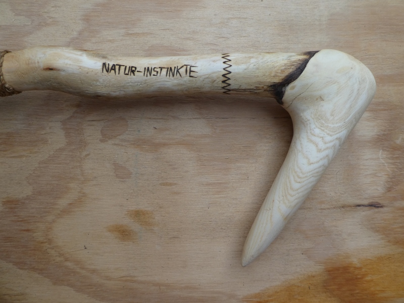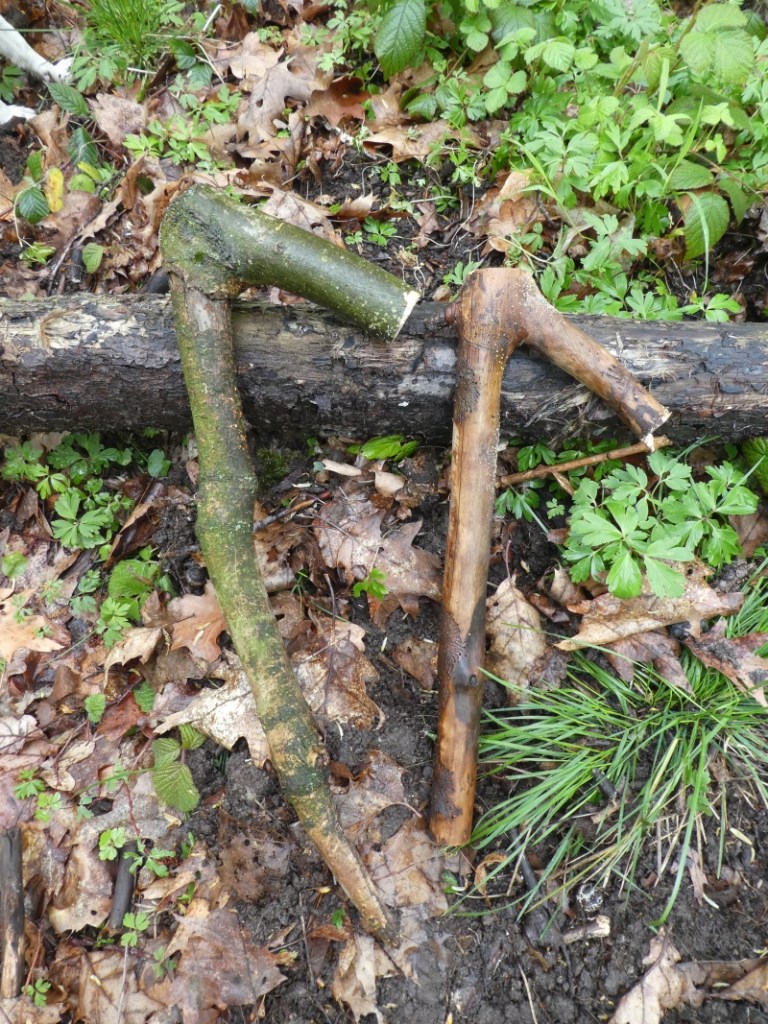 Wir nutzen möglichst hartes Holz, hier war es Esche, das durch Sturm oder forstwirtschaftliche Arbeiten herum liegt. Und dann heißt es Blicke schweifen lassen und Vorstellungskraft aktivieren. Irgendwann taucht er schon auf, der der es sein soll – der eine wahre Grabstock.
