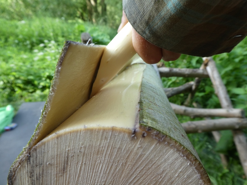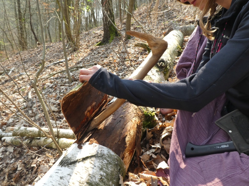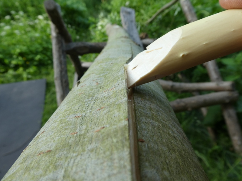 Für den Bau der BirkenRindenKelle und der Weidenkelle war der Grabstock auch ein praktisches Rindenabhebelwerkzeug.