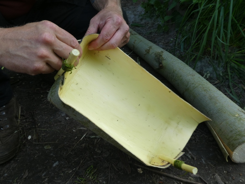 Für einen Rindentopf braucht es möglichst großflächig biegsame Rinde. Mit Messer und Grabstock lässt sich diese gut vom Baum schälen. Es eignet sich eine abgerundete, spatelartige Hebelfläche.
