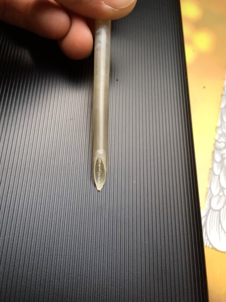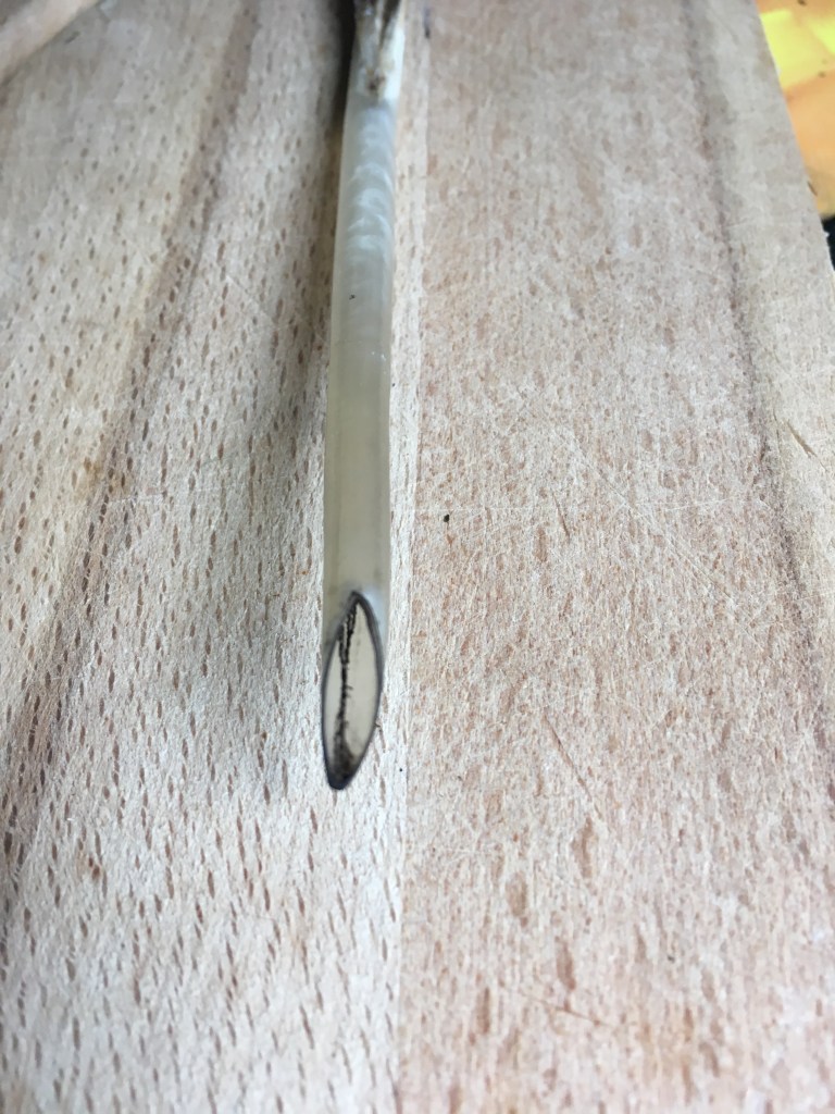 In ca. zwei Minuten ist eine BambusSchreibFeder geschnitzt. Schräg abschneiden; dann das weiche Innenleben entfernen so dass Raum als Tintenspeicher entsteht; und wichtig: eine Kerbe als Leitung zur Spitze einschneiden; die Spitze bestimmt die Schriftart mit und kann beliebig gestaltet werden kann – z.B. Spalten = Doppellinie