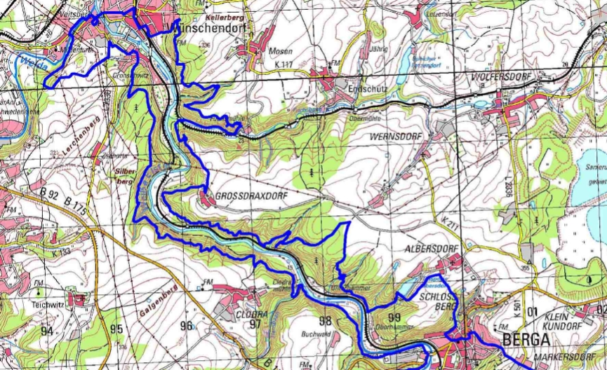 Wir haben am Sonntag, 15.9. gemütlich unsere Rucksäcke gepackt. Drin ist Bad, Brot, Bett und etwas Technik. Feste Etappen und Nachtlager gab es nicht, wir haben den Weg einfach auf uns zu kommen lassen. Bei sonnigen 24 Grad sind wir im Outdoorcamp (auf der Karte: am Schloßberg) nördlich von Berga losgelaufen in Richtung Wünschendorf.
