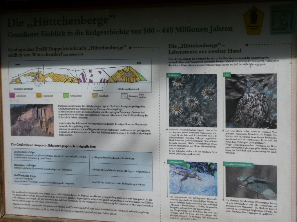 An der Teufelskanzel sahen wir von Weitem die roten Felsen der Steinbrüche Hüttchenberge. Serpentinenartige Pfade führten wieder ins Tal. Die Steinbrüche (südlich von Wünschendorf) wollten wir uns von unten ansehen. Ein eindrucksvoller Anblick! Den dort verorteten Geocache konnten wir aber nach langer Suche leider nicht finden.