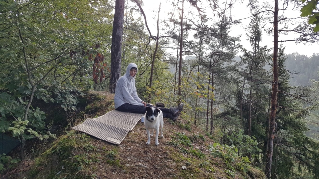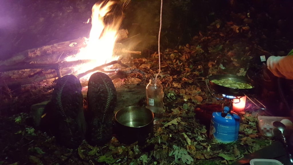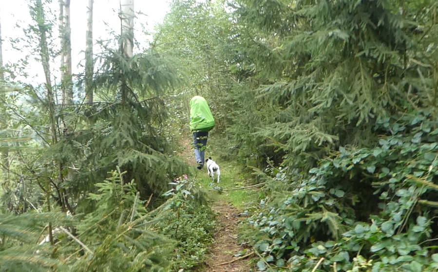 Der Montag war ab Berga von Regen geprägt, aber der Weg führte durch märchenwaldige Abschnitte mit engen Pfaden und schön-waldiger Umgebung. Als gegen Abend das Schuhwerk langsam durchnässt war und die Dämmerung einsetzte, sind wir mit unseren Pilzfunden in eine alte Wallanlage geflohen und haben uns ein trockenes Lager errichtet. Der Regen half uns, den Wasservorrat etwas aufzufüllen. Und wegen des Regens war ein kleines Feuer zum Schuhe- und Kleidungtrocknen gut zu verantworten und hilfreich.