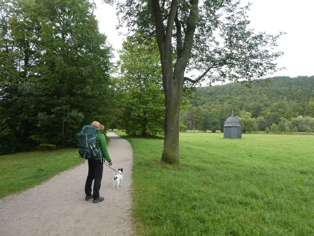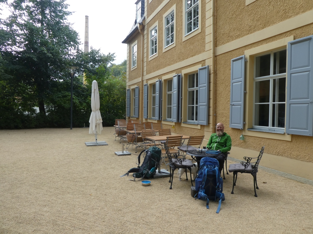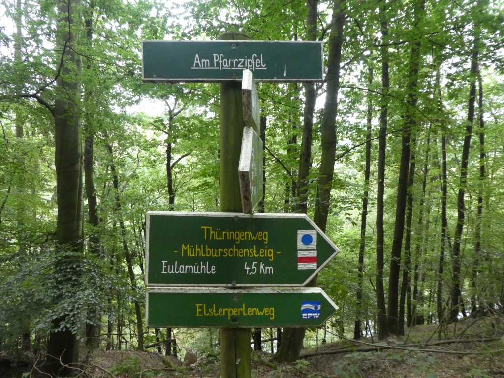 Am MittwochMorgen bekamen wir in der Dialyse-Station unsere Wasserflaschen aufgefüllt und verließen Greiz wieder auf steilen Waldpfaden. Der Pulverturm und das Weiße Kreuz liegen als ausblickfreundliche Punkte auf der Route. Am Kreuz waren diverse Betriebsausflügler und Wanderer anzutreffen und wir haben unsere Rast etwas abseits gemacht, bis wieder Ruhe am Aussichtspunkt eingekehrt ist.