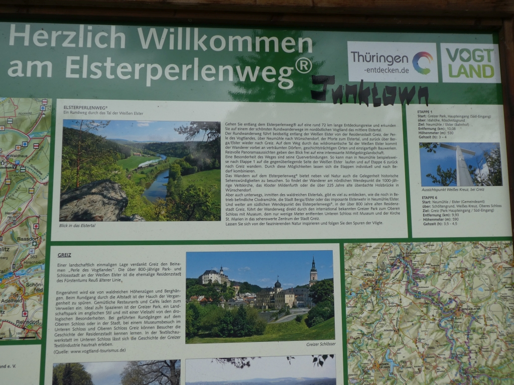 Der Plan war es, in Greiz noch unsere Lebensmittelvorräte aufzustocken, bevor wir wieder ins Grüne verschwinden wollten. Allerdings ticken in der Stadt die Uhren weiter und so sahen wir (offenbar um 18 Uhr) dass, wie im schlechten Film, vor uns die Auslagen der Läden hereingeholt und die Gehwege hochgeklappt wurden…