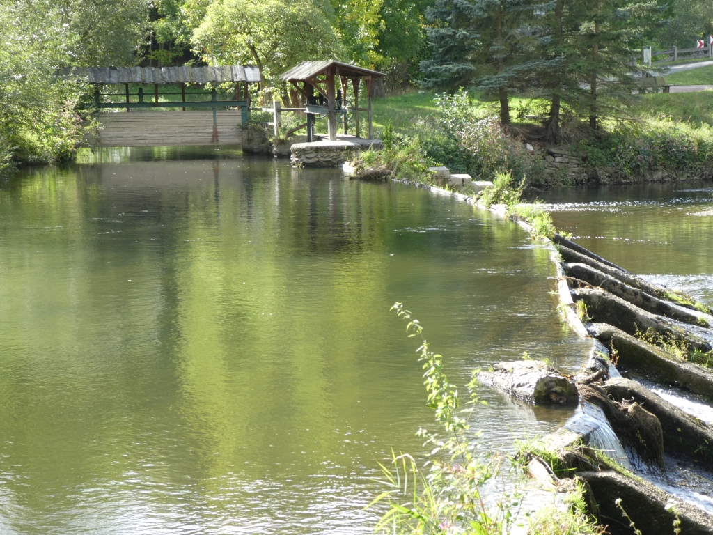 Wir haben etwas weiter unten am Ufer Rast gemacht und auf das kleine Wehr mit Bootsrutsche und die blaue Brücke geschaut, die wir am Vortag noch in nördlicher Richtung gestreift hatten.