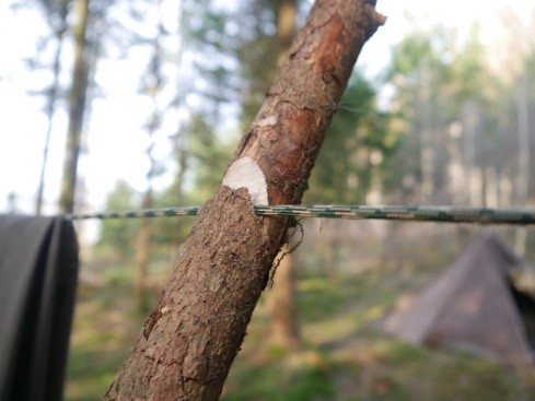 Draußen lässt sich ganz einfach eine Wäschestange improvisieren, wenn die gespannte Leine mal zu lang ist und alles etwas durchhängt. Es wird einfach ein langer Ast oder ein dünner Stamm genommen und eine Kerbe hineingesägt oder geschnitten, bis die Schnur hineinpasst. Oder ein langer Stock mit einer Astgabel oben dran. Das spart das Sägen oder Schnitzen.