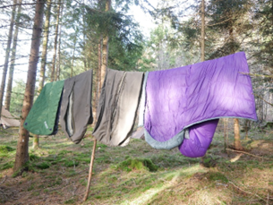 Wenn wir unterwegs auf einer Tour sind, hängen wir den Schlafsack draußen irgendwo auf, meistens an einem stabilen Ast oder an einer Schnur, die wir gespannt haben. Sind wir dagegen nur auf einer Tagestour oder in einem Waldcamp und kommen am nächsten Tag gleich wieder nach Hause, hängen wir unsere Schlafsäcke an einem trockenen Ort im Haus nochmal auf zum Trocknen und Lüften.