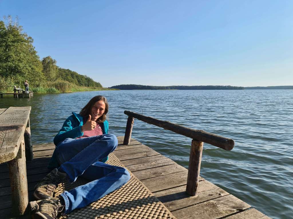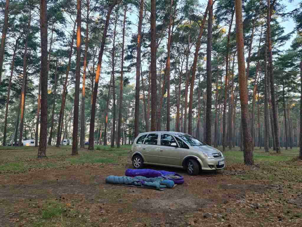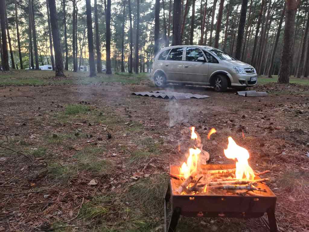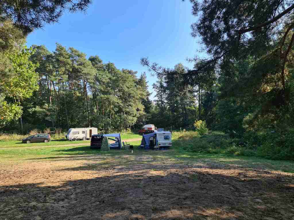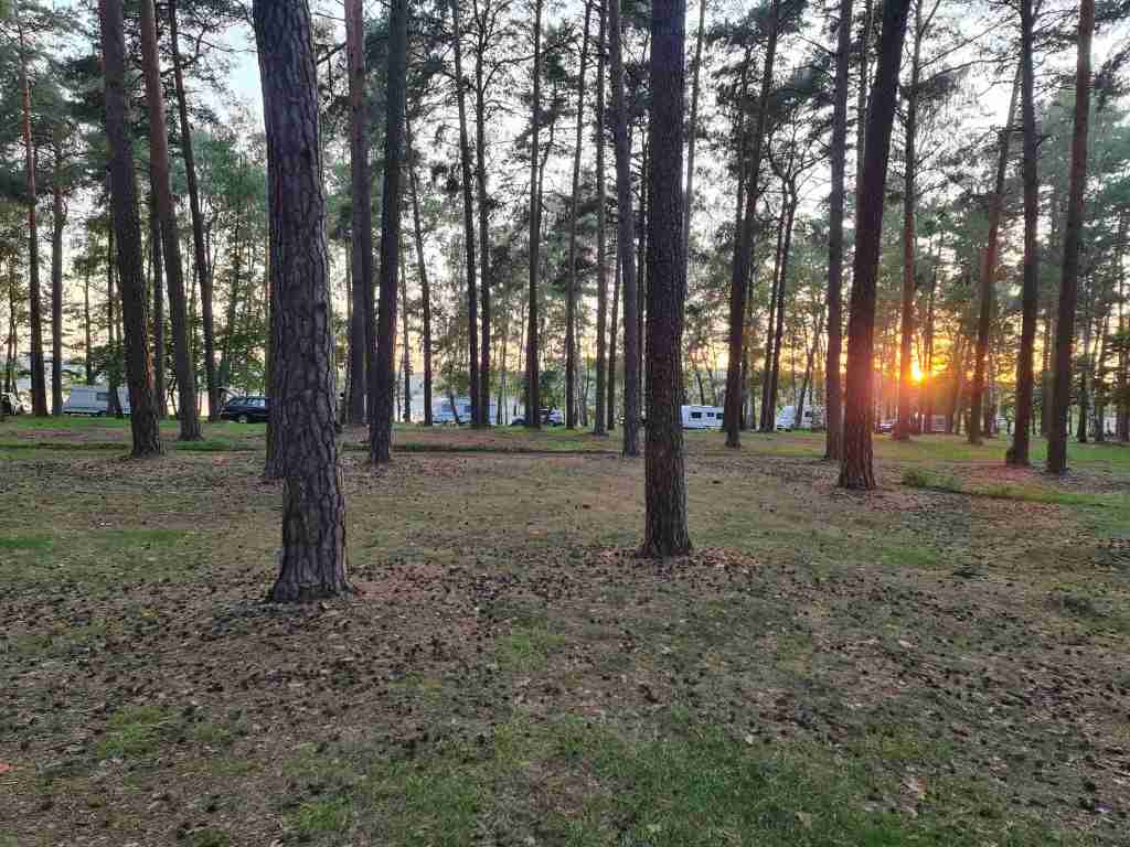 Der Boden ist sandig und überwiegend mit Kiefern bewachsen. Ein paar Tagesgäste nutzen die letzten warmen Tage zum Baden und Angeln, ein paar Dauercamper hören polnische Hits. Wir besiedeln eine höher gelegene Fläche geschützt unterm Kieferndach am Waldrand.