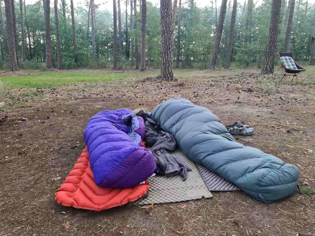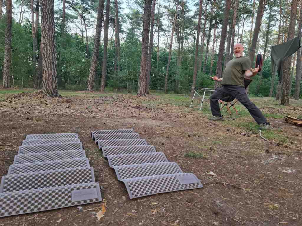 Wir kochen auf unserem kleinen Klapp-Grill und nutzen ihn auch als kleine Feuerstelle am Abend. Übernachtet wird ohne Dachkonstruktion, auf unseren Faltmatten, einer aufblasbare Isomatte und in unseren Winterschlafsäcken. Außerdem hat jeder ein kleines Outdoor-Kopfkissen dabei.